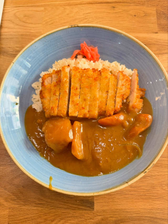 - Ramen avec tranches de poulet frit, œuf entier, légumes.