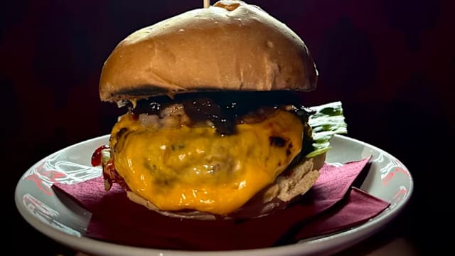 Pane bun, doppio hamburger di manzo, triplo strato di bacon crispy, formaggio fontina, cipolle croccanti fritte, salsa maple-bacon (sciroppo d’acero + mayo + senape.)