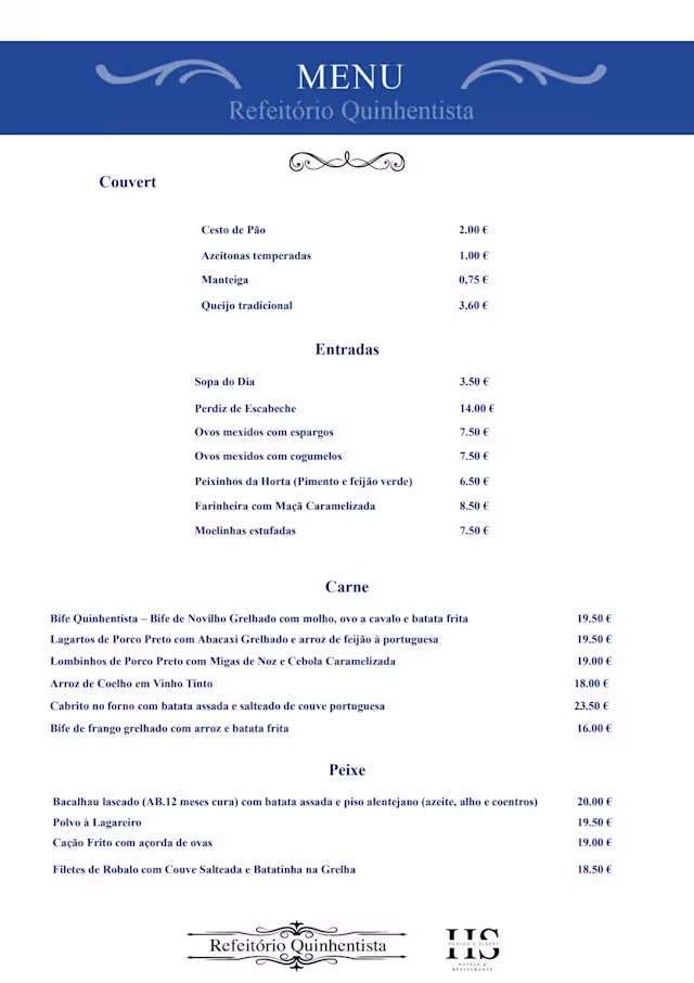 10/10Fantastic lunch. Amongst the starters the farinheira with caramelised apple stood out. Since all of us had the lombinhos de porco preto, we can only comment on this one main dish. It was amazing. Tasty meat! We definitely will return. The atmosphere is also very nice as the historical building has been decorated tastefully. Staff was very friendly.