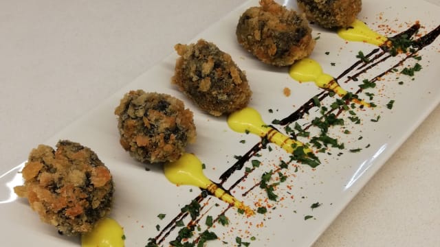Tataki de atún con shiitake, salsa teriyaki y alga wakame