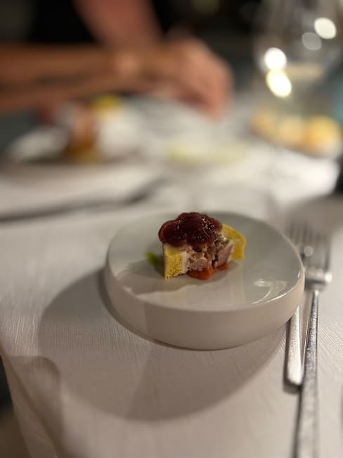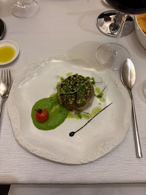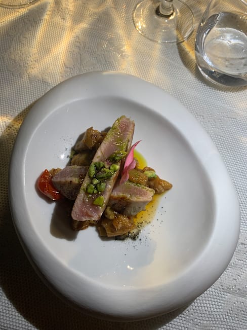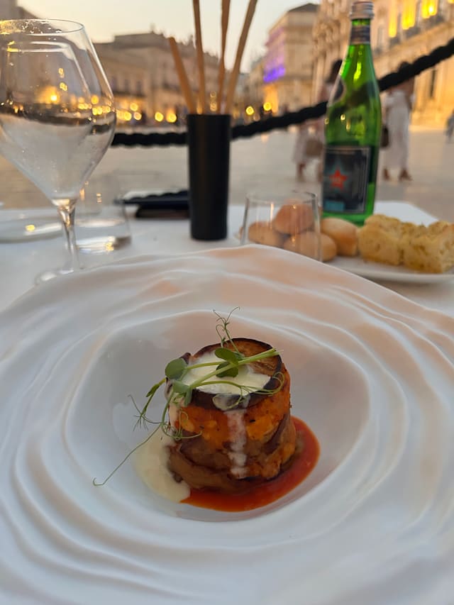 7.5/10This restaurant has the most magical setting. You can sit outside in the most gorgeous piazza. People watching from here is great. The restaurant is in the corner of the piazza so people don’t walk directly past your table! The view of the historic cathedral and associated buildings makes you feel so calm. We had the 7 course tasting menu. The food was OK but for us a bit dull. We were expecting to be as blown away by the food as we were the surroundings. Unfortunately that wasn’t the case. That said it was a nice evening and added to the enjoyment of our holiday. We tried 3 of the 4 Michelin recommended restaurants in Ortigia. For us this one came 3rd behind Don Camillo and Porta Marina De Salvo.