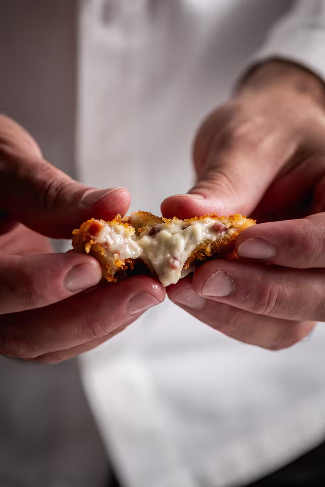 - Espárragos trigueros a la brasa, panceta curada y emulsión de yema