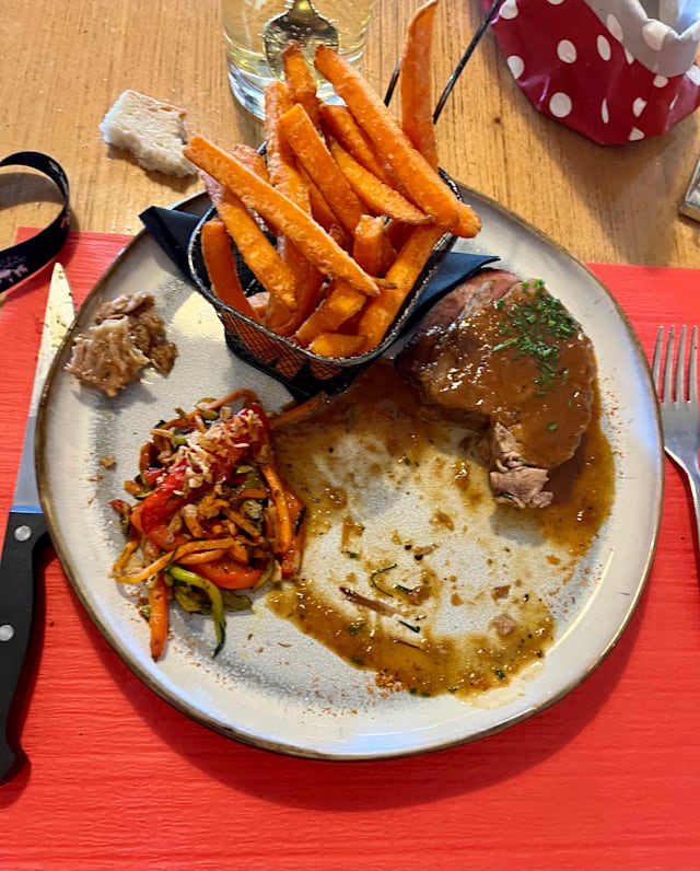 Entrecôte de bœuf maturée, servie avec frites fraîches, légumes de saison, sauce au choix