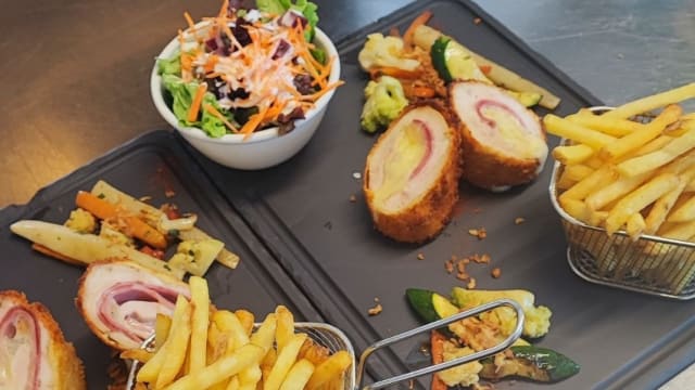 Buns brioché maison, steak smash, cheddar, lard fumé, oignons grillés, salade, tomate, mayonnaise à la truffe, frites fraîches