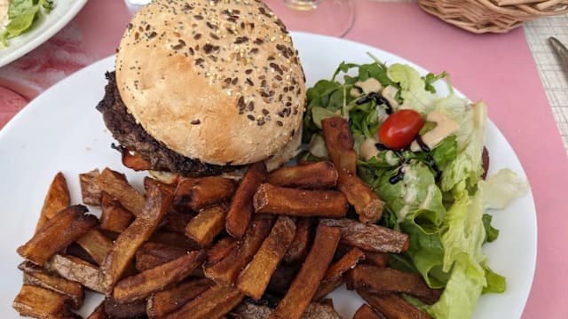 - Steak haché pur bœuf 180g, tome des bauges fondue, salade, tomate, confit d'oignon et ail maison