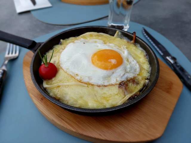 - La croûte du chef : fromage à raclette, oignons fondants, lardons dorés, œuf coulant.
