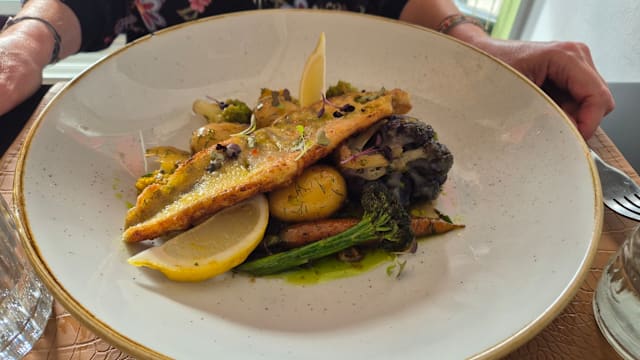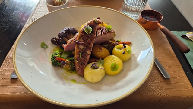Magret de canard / boulettes silésiennes / légumes de saison / sauce cerise-groseille