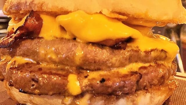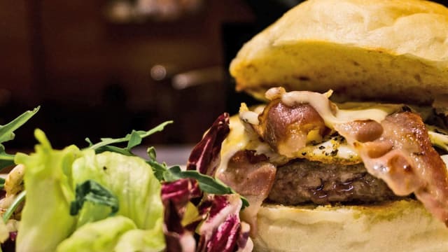 Doppio hamburger di vitello locale, triplo bacon croccante, doppio cheddar e scamorza filante salse maionese e BBQ. insalata iceberg e cipolla in agrodolce.