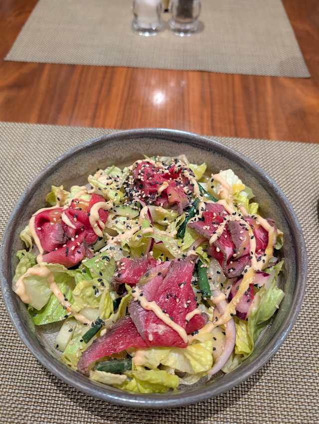 - Alface Romana, feijão quénia, pepino doce, malagueta, cebola roxa e molho satay