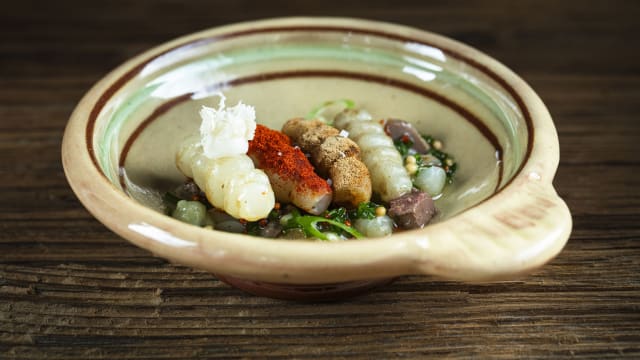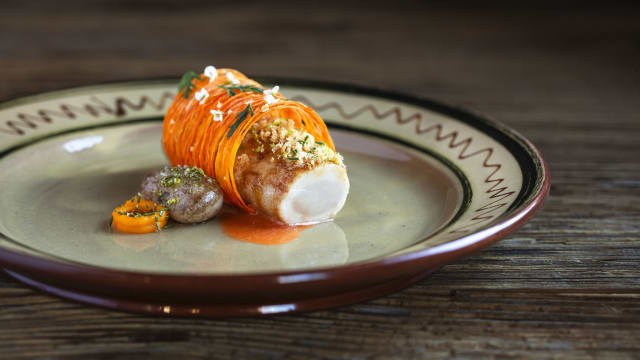 Roasted then smoked veal sweetbread, glazed with a sweet and sour sauce, Russian cigarette with horseradish, Agria potato chiffonade.