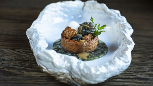 Grilled pig’s ears with fir buds, pork shank served in a pearled aubergine consommé.