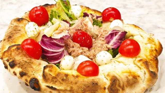 Base covaccino, a crudo: mozz. Di bufala D.O.P, prosciutto crudo, rucola, scaglie di g. padano, pomodorini, stracciatella,