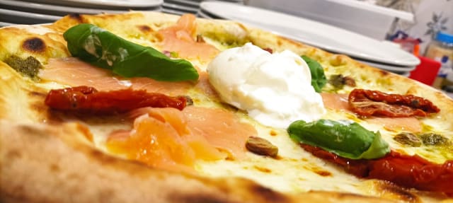 Mozzarella di bufala D.O.P, salmone affumicato, pomodori secchi, pistacchi crema di pesto basilico olio EVO