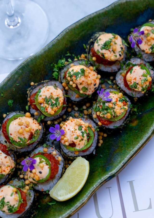 - Tempurafriterad scampi, gurka, avokado, gräslök, toppad med tartar av tonfisk, lime, koriander, sesam, gochujang, pebremajo, puffat ris, jalapeno, togarashi.