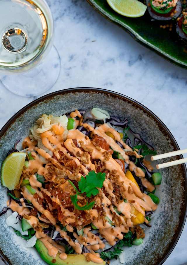 - Lax marinerad i soja, sesamolja och ingefära, mango, avokado, sesam, edamamebönor, koriander, rostad lök, chilimajo, inlagd ingefära.