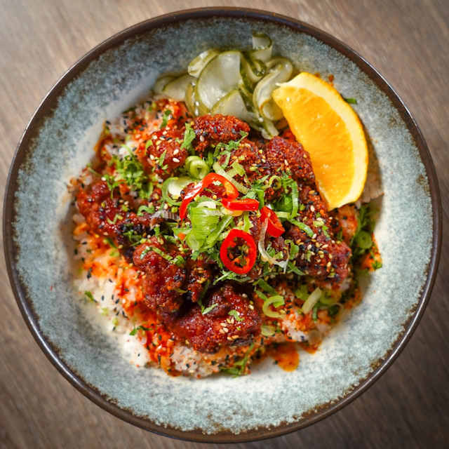- Friterad kyckling, koreansk bbq-sås, sesam, salladslök, soja, koriander, togarashi, chili, apelsin, picklad gurka.