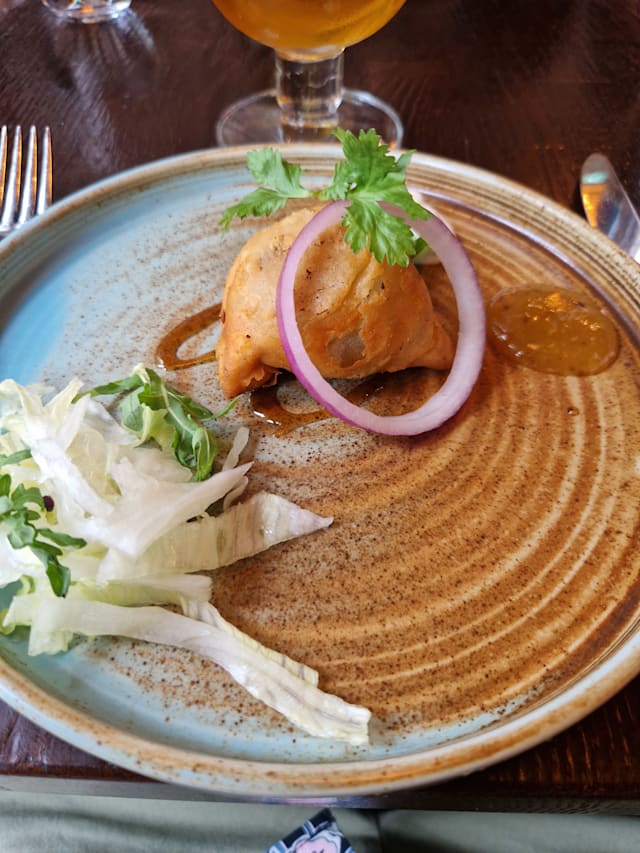 Friterad pirog. Välj mellan fyllda med grönsaker eller fylld med lammfärs. Serveras med hemmagjord lökpickles och raita.