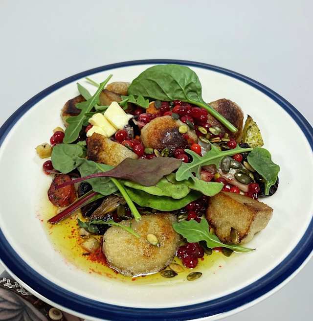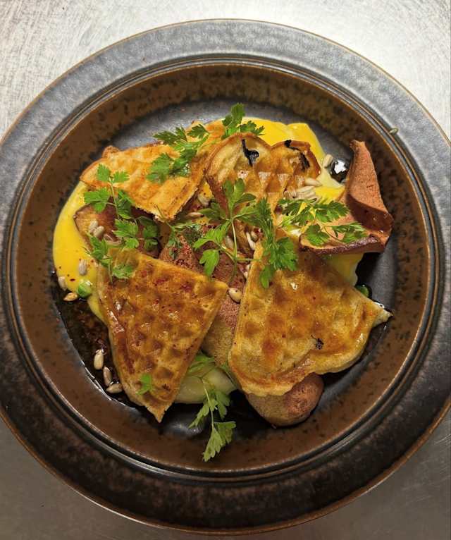 - Ekologisk stekt palt, hallstaviks tempe på svenskodlade baljväxter. Rostade rotfrukter, lingon & veganskt smör.