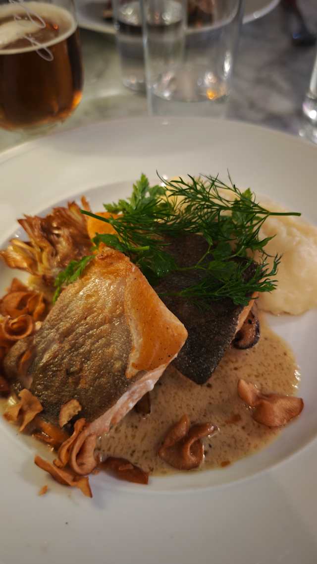 - Smörstekt fjällröding, rostad kronärtskocka, jordärtskocka, dragonveloute, king oyster svamp, potatis- & västerbottenostpuré