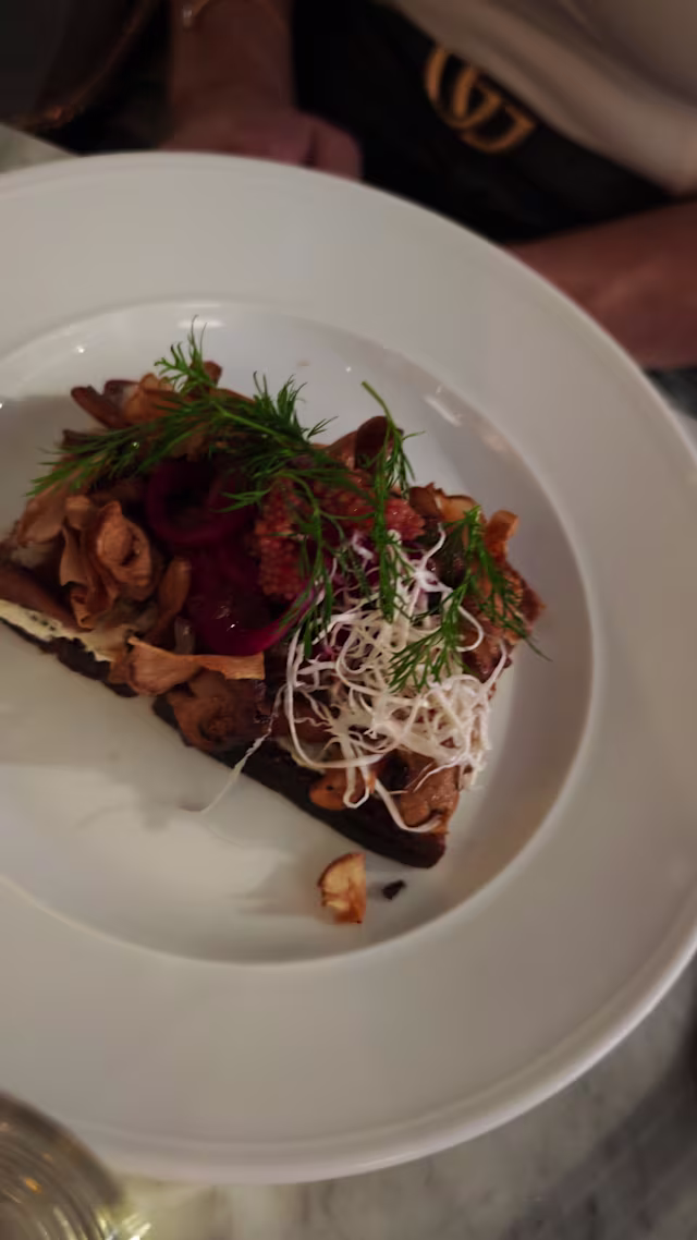 - Smörstekta kantareller, tryffelcreme forellrom, picklad rödlök, friterad jordärtskocka, smörstekt surdegsbröd