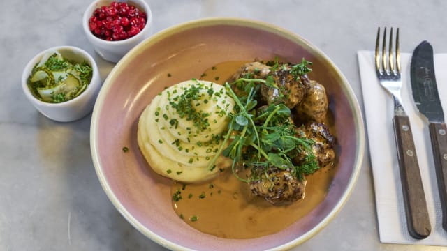 Egen rullade köttbullar med gräddsås, rår- örda lingon, pressgurka & potatispuré