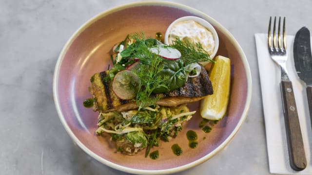 Med löjrom, crudité, sandefjordsås & potatispuré