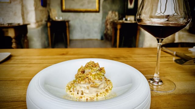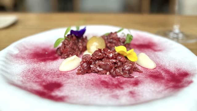Tartare di manzo podolico, uovo di quaglia marinato e crema al topinambur