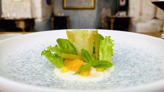 Finocchio gratinato, gel di arancia e salsa al castelmagno