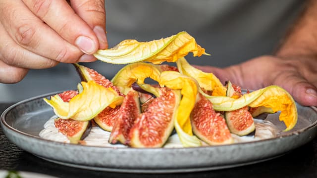 - Carpaccio de courgette, velours basilic & tomates, fleurs de courgette