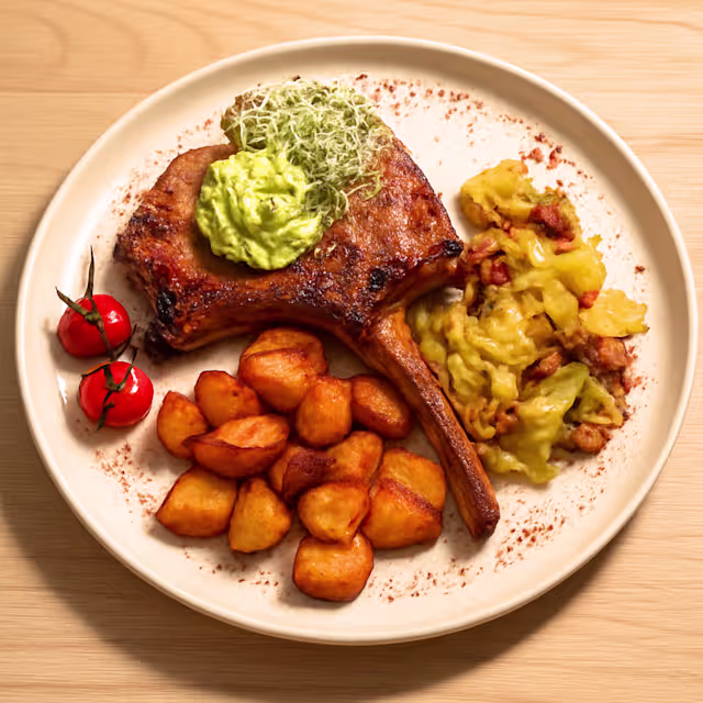- Côte de porc cuite à basse température et sa gremolata, pommes de terre rôties et légumes de saison