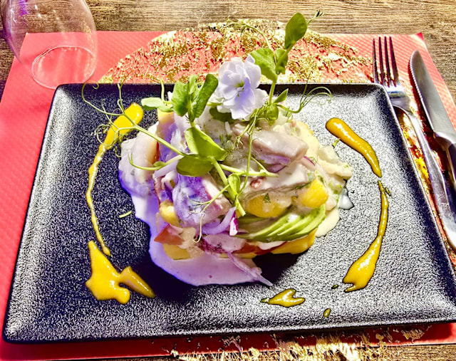 Purée de pommes de terre au citron et piment jaune péruvien, avec avocat frais, garnie d’un tartare de bœuf assaisonné à la lime, coriandre et huile d’olive — une rencontre élégante entre le Pérou et la gastronomie française.