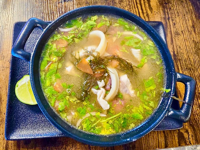 Bouillon péruvien de fruits de mer infusé au safran, relevé de citron vert, coriandre fraîche et maïs croquant (cancha). Servi avec des toasts et une rouille française pour une touche méditerranéenne.