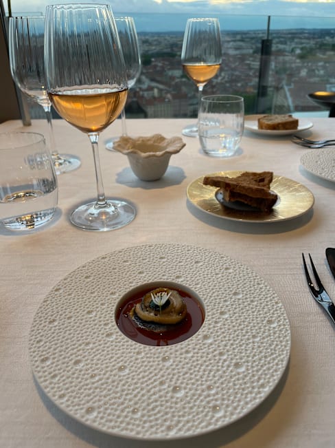 10/10The food and the service were as splendid as the view of Lyon as the sun was setting. I enjoyed every bite of all six courses, with the amuse bouches and pre and post desserts. The wine pairings were excellent. A meal well worth its cost.