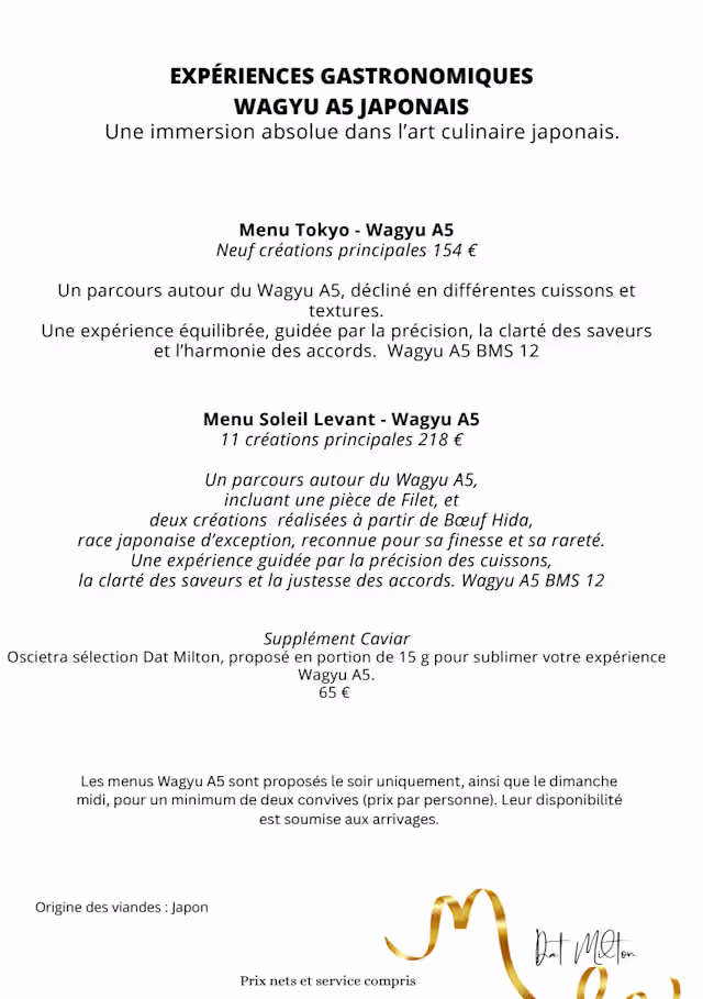 Chaque menu est un voyage guidé par les saisons, les produits du jour et l’inspiration du Chef. La surprise fait partie du plaisir : nous adaptons chaque expérie...