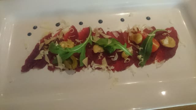 Gevuld met aubergine en pecorini, gepofte tomaat en rucola
