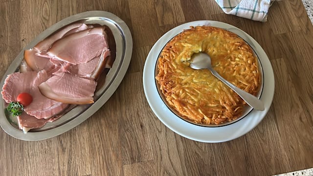 - (La jambonnière à mézières) ce jambon est accompagné de roestis (min. 2 pers.) ou de frites.