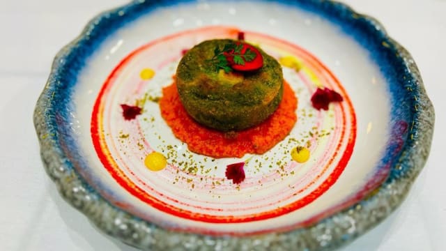 Fromage indien avec sauce aux noix de cajou, épices et tomates, légumes du marché, riz basmati.