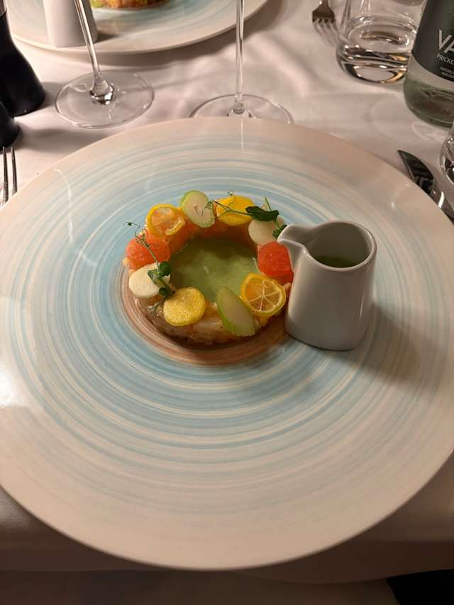 - Tartare de saumon aux aromates - Ravioli artisanaux basilic et tomate- Entrecôte Black Angus argentin- gratin et légumes du jour- assortiment sorbets maison