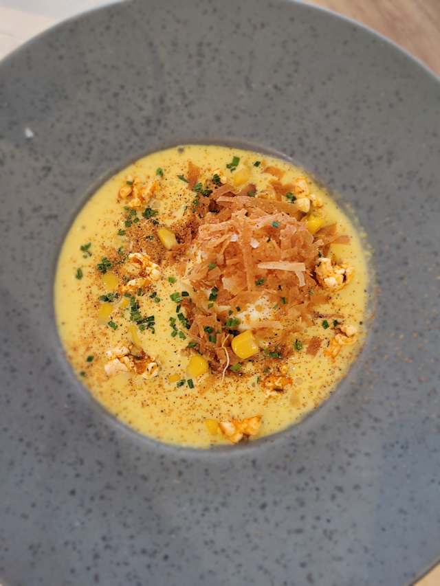 - Oeuf mollet, lardons, crème de poireaux et chips de lard