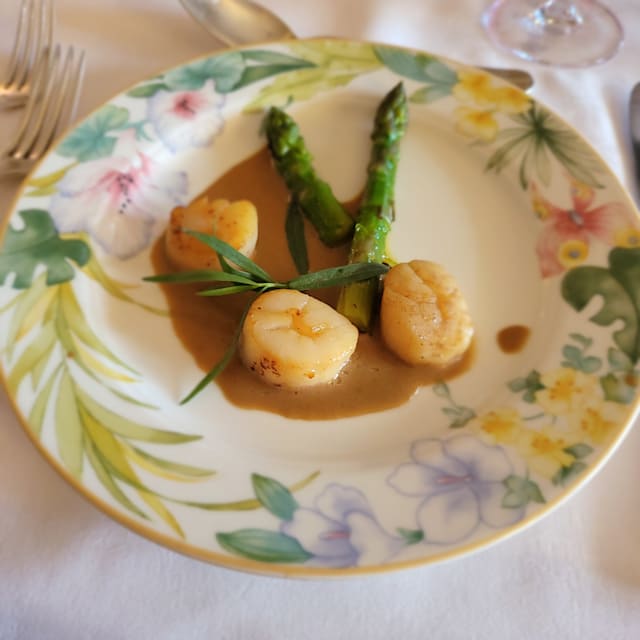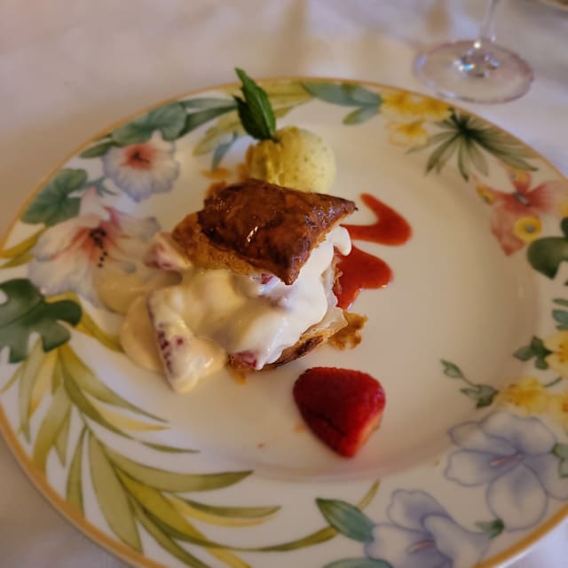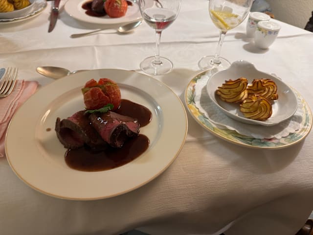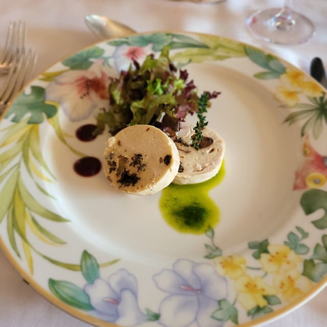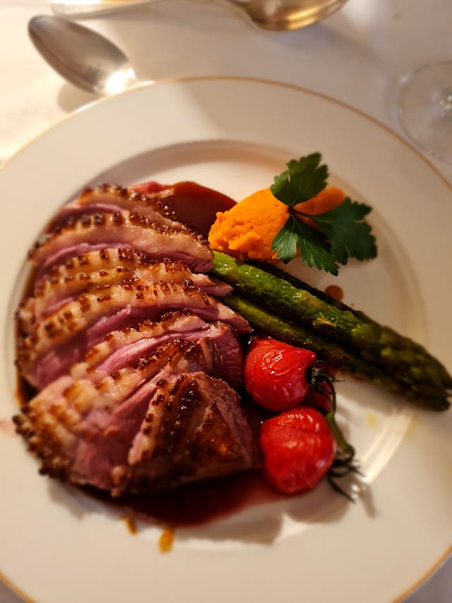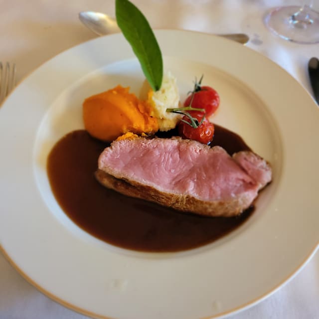 The moment we walked in, we felt we’d walked into la belle epoque. A charming sauna entrance to the right, a grand staircase to the elegant dining salon overlooking Lac Leman/Geneva. The aroma of chef Laurent’s cooking confirmed we picked the right dinner spot! The Fixed P menu included creamy cauliflower soup (the absolute best we ever had despite eating at Michelin star restaurants). My garden salad was so fresh & crisp as tho’ the lettuce, tomatoes were just picked from the garden that day! Chicken supreme perfectly cooked & spiced. Portion size could’ve been a bit larger to start (as with most French servings). Our superb waiter Remy was nice enough to ask if we wanted more but we declined since my hubby had to help me finish my sumptuous main of Duck à l’Orange. Spaëtzle & petit pois with bacon could’ve been a little hotter. Dessert:poached pear with creamy chocolate sauce & whipped cream. Book thru The Fork & get 20% off food on NON-FixedP Menu. Loved the place!!