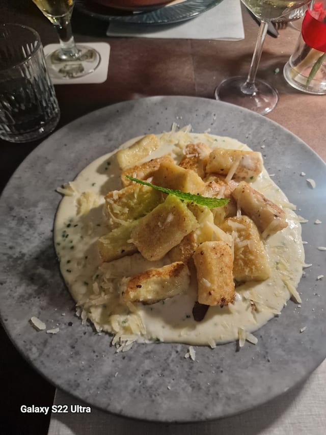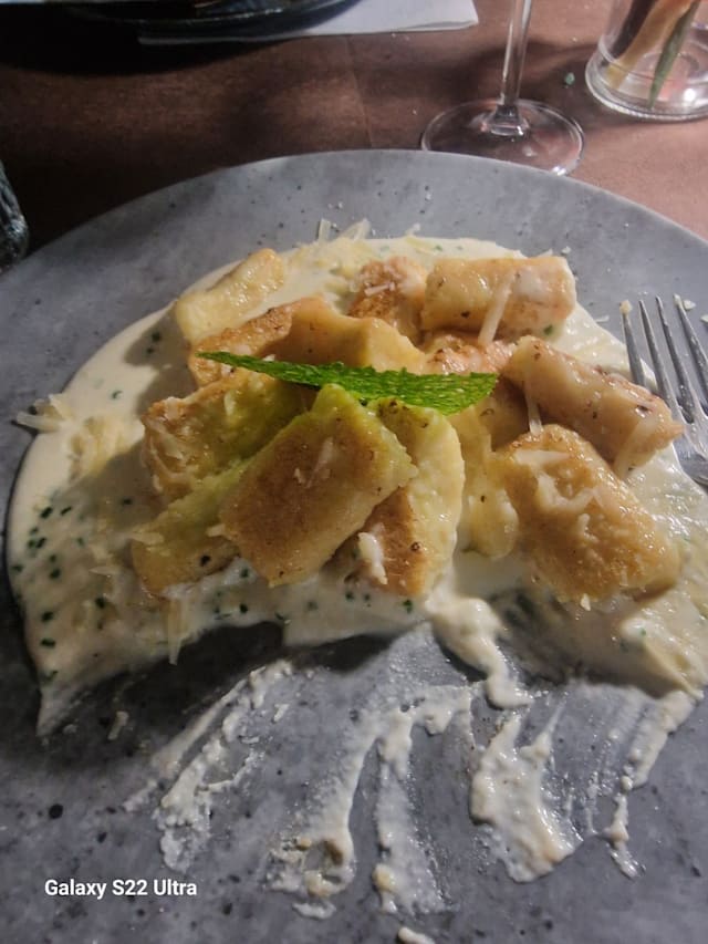Hausgemachte kartoffel kürbis gnocchi in gorgonzola und nuss creme