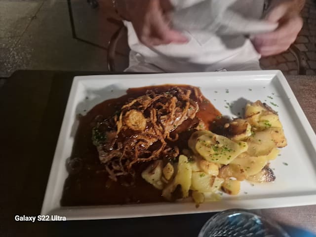 Rinds filet vom grill serviert mit kartoffel-kürbis-gröstl in rotwein soße