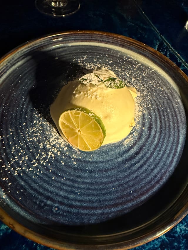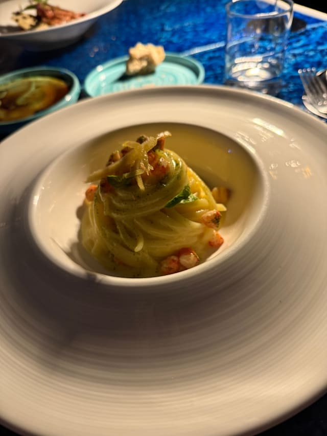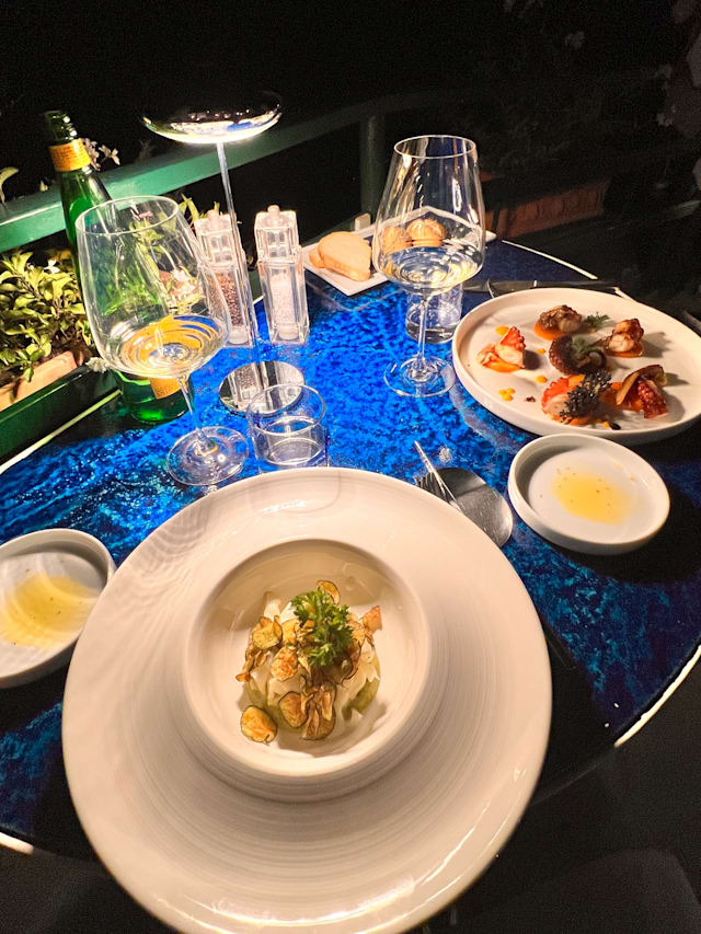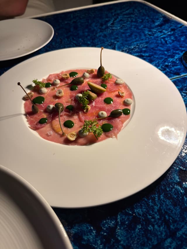 Risotto with zucchini cream, tuna carpaccio and marinated egg yolk