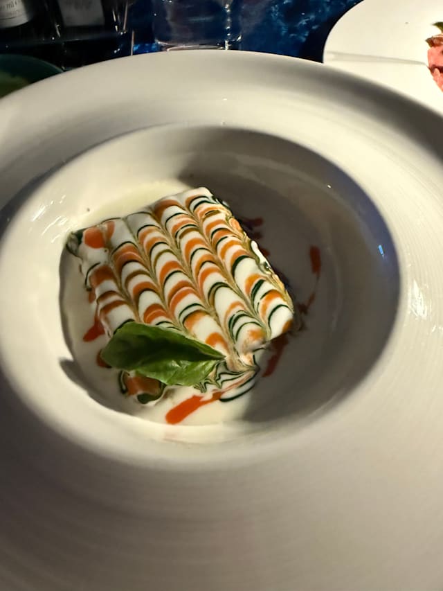 Stuffed homemade pasta with Genovese sauce (beef and onion) served on provolone del Monaco cheese sauce