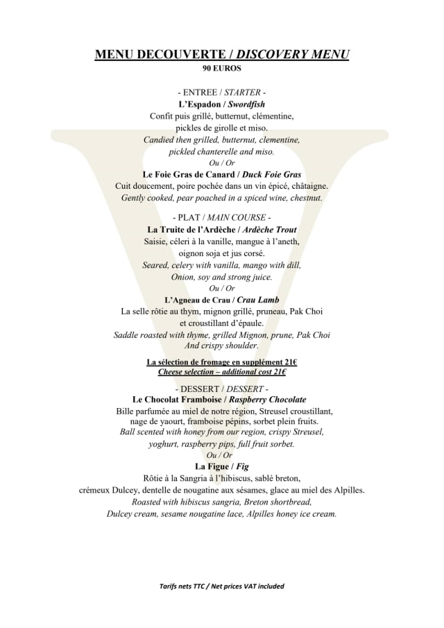 8.5/10The setting is a beautiful terrace overlooking the pool/garden area. The service was very good, friendly, polite without being familiar. Whilst the setting was lovely, there was a slight sense of “stuffiness”. One of us had the MENU VALRUGUES @ €105, the other the MENU DECOUVERTE @ €90. The Valrugues suffered from too many different flavours and textures, some of which worked and others didn’t. The quality of the food and the preparation was without question. The Decouverte offered simple choices for each of the 3 courses; fish was chosen for the entree and plat. This menu seemed to work much better; the flavours melded together and the fish was without fault. The Decouverte offered better value for money with a more satisfying finish in the mouth. The impression from the Valrugues was that it was trying too hard. A worthwhile experience but choose wisely.