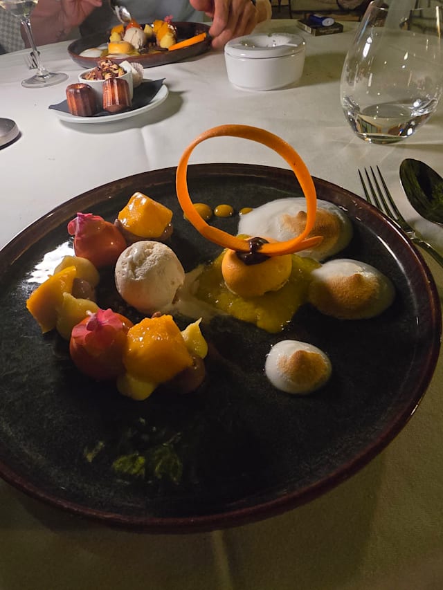 The setting is a beautiful terrace overlooking the pool/garden area. The service was very good, friendly, polite without being familiar. Whilst the setting was lovely, there was a slight sense of “stuffiness”. One of us had the MENU VALRUGUES @ €105, the other the MENU DECOUVERTE @ €90. The Valrugues suffered from too many different flavours and textures, some of which worked and others didn’t. The quality of the food and the preparation was without question. The Decouverte offered simple choices for each of the 3 courses; fish was chosen for the entree and plat. This menu seemed to work much better; the flavours melded together and the fish was without fault. The Decouverte offered better value for money with a more satisfying finish in the mouth. The impression from the Valrugues was that it was trying too hard. A worthwhile experience but choose wisely.