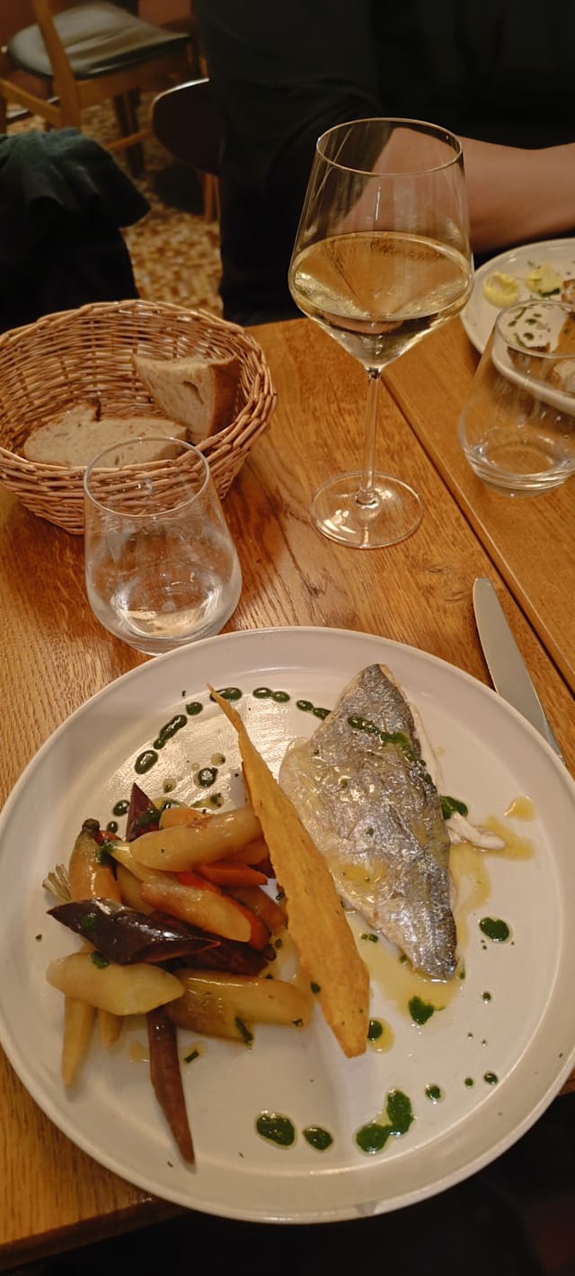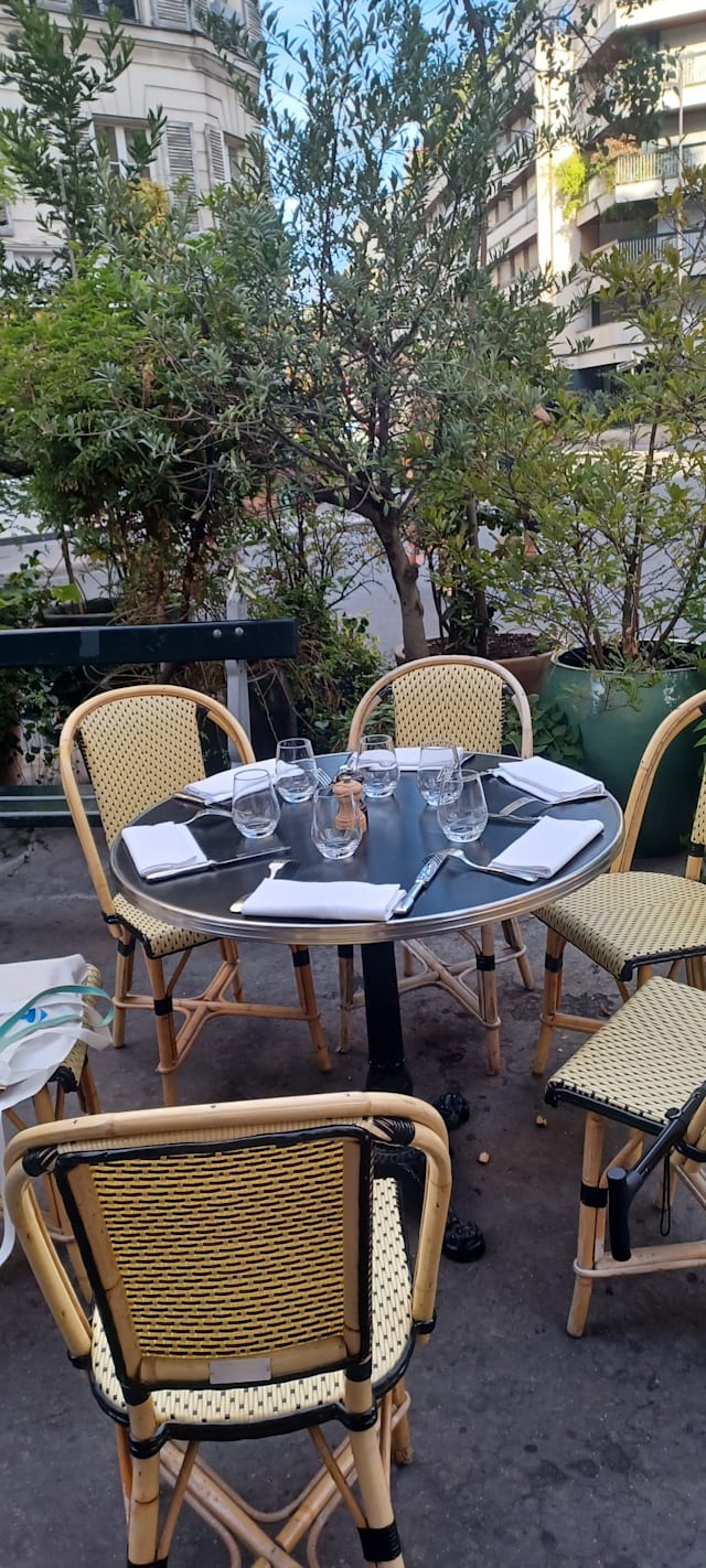 7.5/10Oops, the bread had been cut early and was stale. We ordered different wines but they tasted the same and were sour. The tomato carpaccio was delightful and volaille very plain and tasty. Swordfish was chewy. Not to be paranoid, but French folks got the nice sidewalk tables and Americans were relegated to the back room on a nice summery evening.