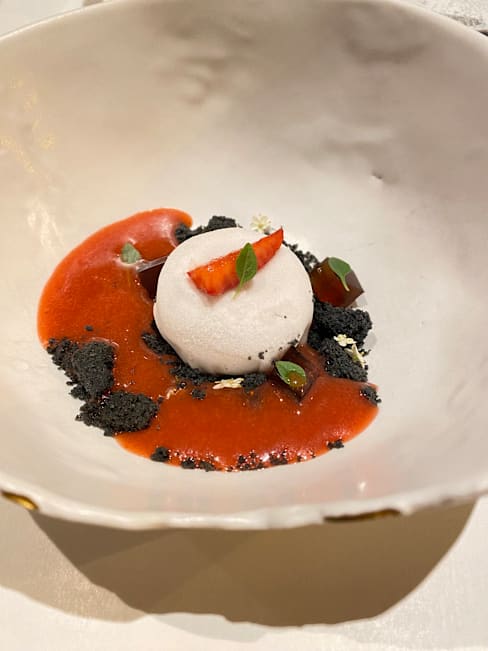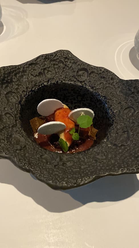 7/10Tomatoes and ice cream do not blend well, resulting in a separation in taste. The green one is temporarily referred to as the soup, which was okay at first but became increasingly salty later on. Fortunately, the main course was very good, and the beef tasted great. The cherry dessert base has an ordinary taste. Overall, there is a lack of expectation