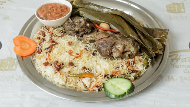 Een traditioneel gerecht afkomstig uit de stad hadramout in jemen, bestaande uit lamsvlees met stukjes lever, en rijst gekookt in een houtgestookte oven in de mandi-put. Het wordt geserveerd met een groene salade, yoghurtsalade en gewone sahawiq, wat zorgt voor een heerlijke en smakelijke combinatie