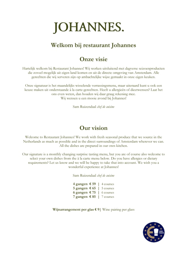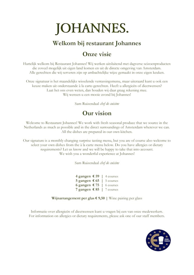 9.5/10We wish we lived in Amsterdam so we could visit again. The meal and all its courses was as flavorful as it was a delight to the eye. It was a cultivated menu with sensitive and careful attention by the staff. The space is intimate but feels open and comfortable. Looking forward to a return visit.